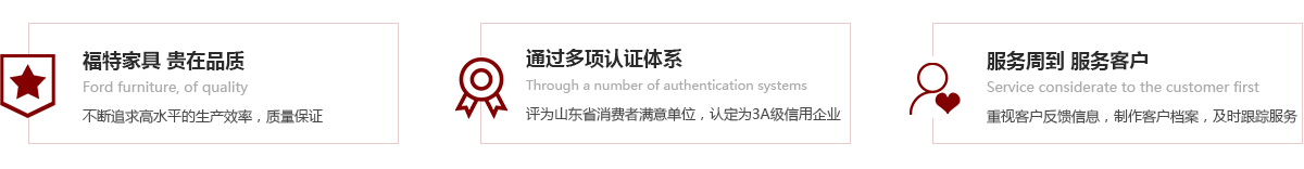 公司全體員工緊緊牢記“福特家具,貴在品質”的承諾,本著“以質量求生存,以信譽求發展”、“誠實守信”的企業理念,力爭“創名優企業,鑄優質品牌”,在全公司上下兢兢業業、認認真真,嚴格要求自己,不斷追求自已,不斷追求更高水平的生產效率,我公司注重質量管理,先后通過了國際質量管理體系ISO9001認證、國際環境管理體系14001認證、職業健康安全管理體系OHSAS18001認證,公司注重品牌建設,先后注冊了“世紀福特”、“杰福特”、“伯爵”三個系列商標,公司連續多年被煙臺市工商局授于“市級守合同重信用企業”稱號,連續被山東省工商局授于“省級守合同重信用企業”稱號,被山東省企業信用與社會責任協會評為“優秀企業會員”稱號,連續被煙臺市消費者協會評為消費者滿意單位,連續被山東省消費者協會評為第八屆、第九屆山東省消費者滿意單位,被認定為AAA級信用企業,隨著社會環保意識的不斷提高,公司2014年4月順利通過了中國環境標志產品認證,2015年8月順利通過了中國質量認證中心CQC環保產品認證,并于2015年12月被評為“山東省著名商標”榮譽稱號。